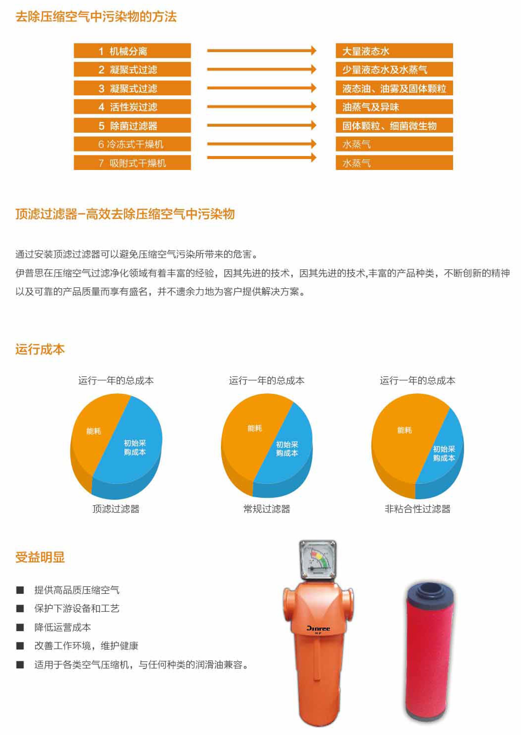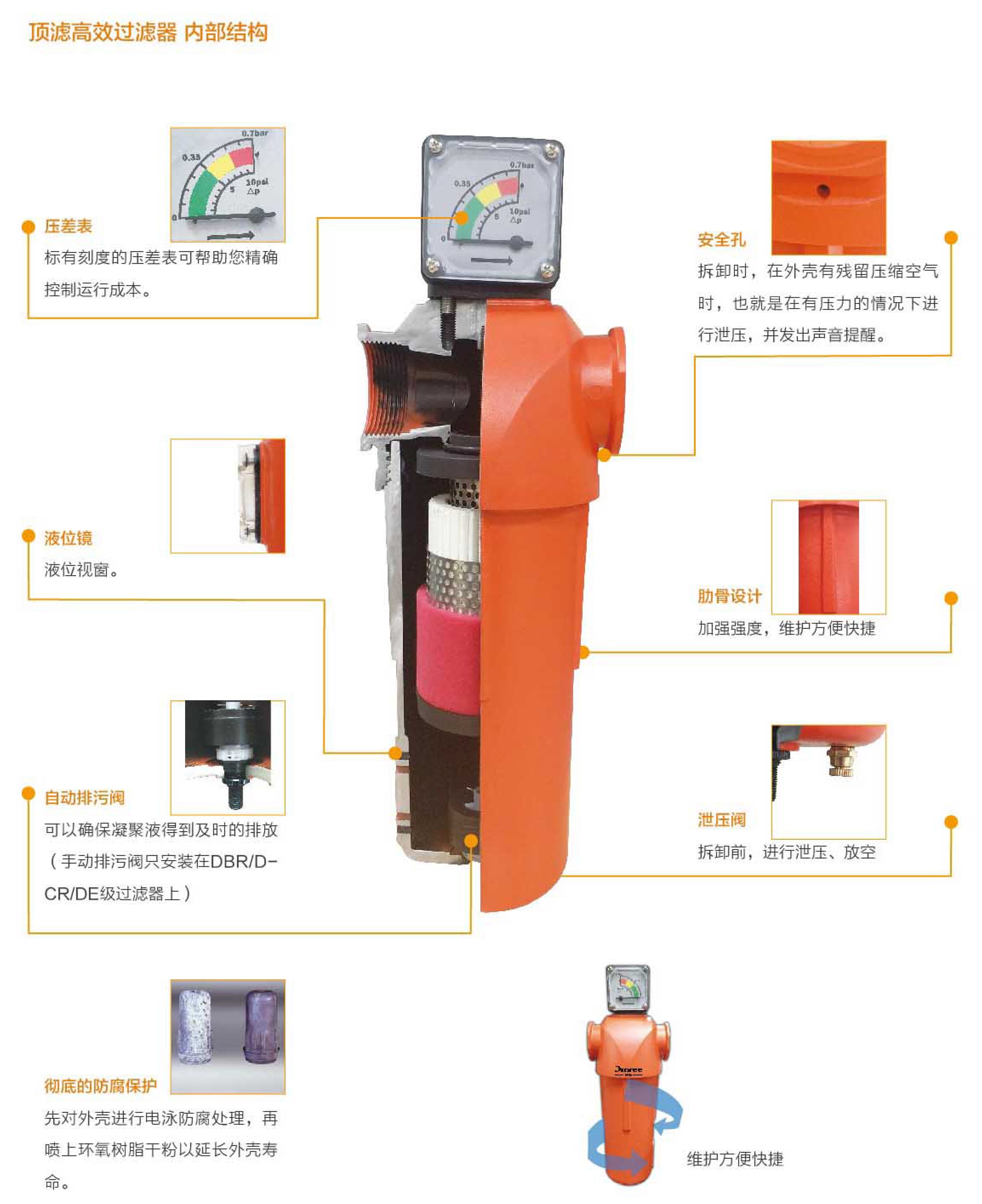 二次过滤器又称分水滤气器,在气动系统中应用最广泛,其滤灰效率为70%~90%。高效过滤器是采用滤芯孔径很小的精密分水滤气器,常用于气动传感器和检测装置等,装在二次过滤器之后作为第三级过滤,其滤灰效率达到99%。